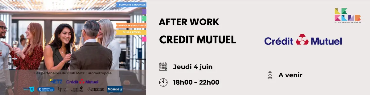 Le Club Metz Eurométropole vous invite à un afterwork en partenariat avec Crédit Mutuel, la jeudi 4 juin pour vivre un moment agréable et dynamique entre professionnels.
