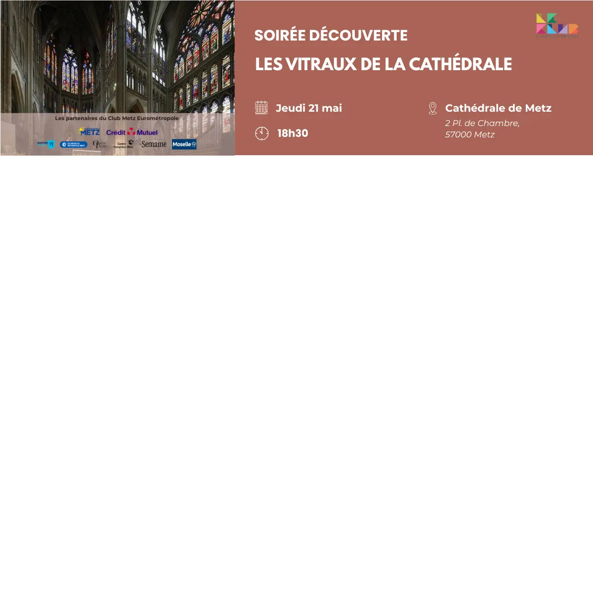 Le Club Metz Eurométropole vous invite à une soirée exceptionnelle au cœur de la Cathédrale Saint-Étienne de Metz, consacrée à la découverte de ses vitraux remarquables. Véritable joyau du patrimoine messin, la cathédrale est reconnue pour la richesse et la diversité de ses verrières.