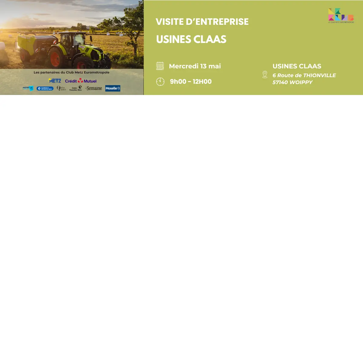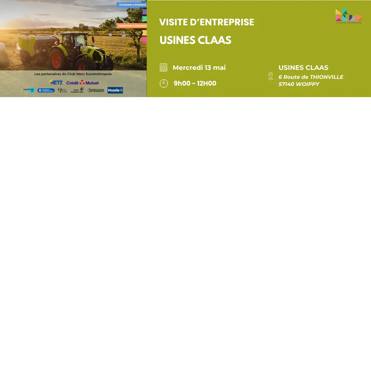 Le Club Metz Eurométropole vous invite à une visite exclusive de l’entreprise CLAAS, le 13 mai, pour une matinée immersive au cœur de ses infrastructures.